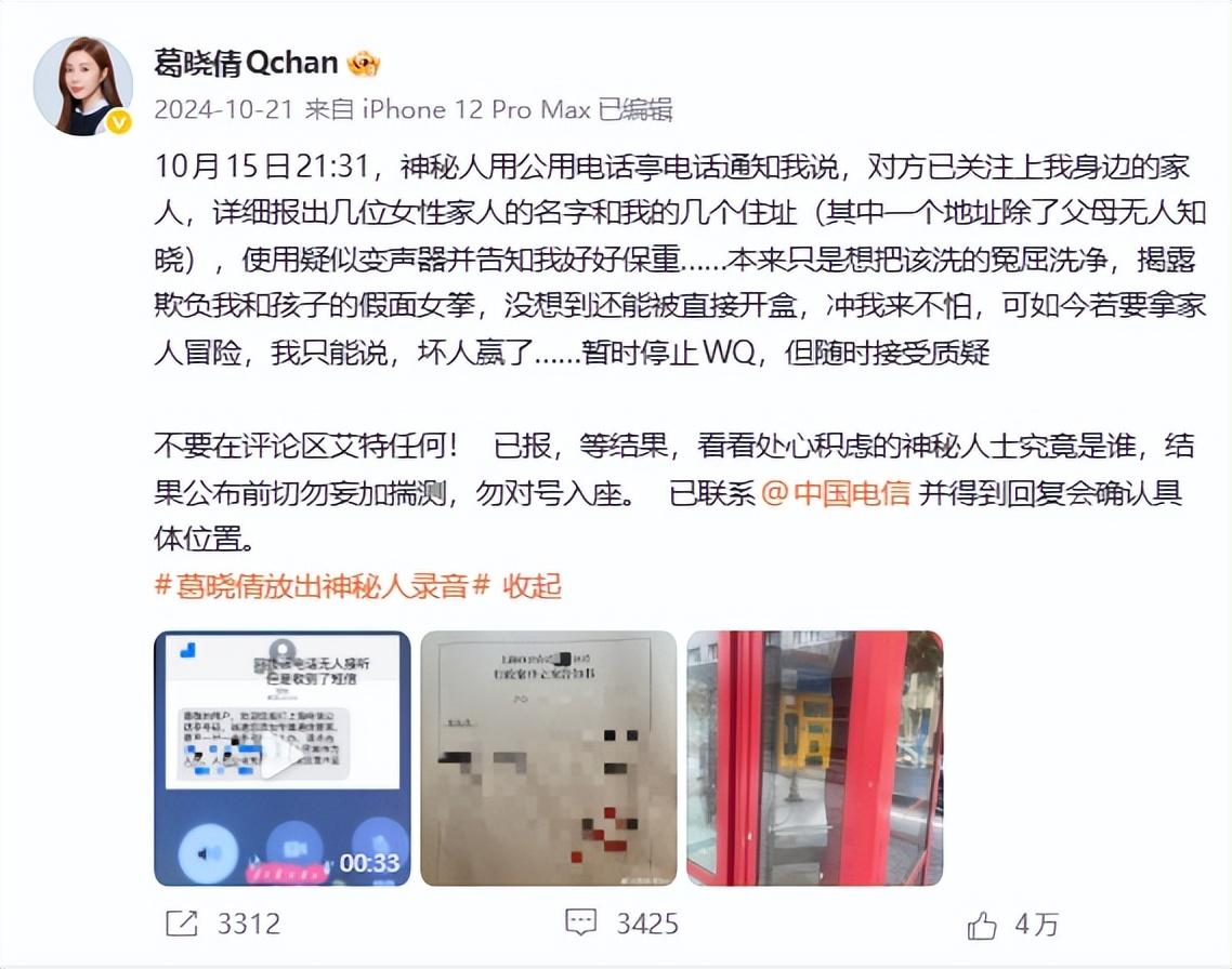葛曉倩稱2024年她發文控訴張雨綺之後,收到神祕人的電話,神祕人用變聲器在電話中報出她家人的名字和她的幾個住址,並告訴她好好保重。