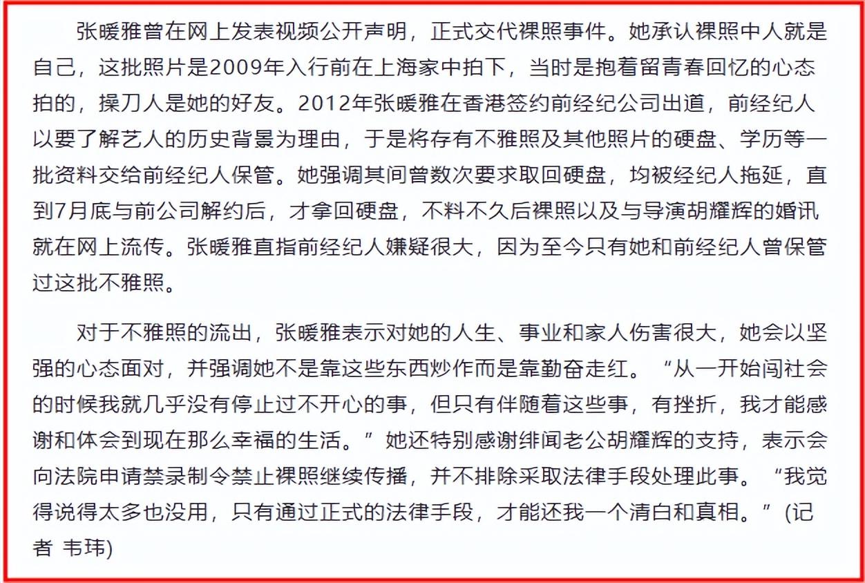 不過,對於裸照事件,張暖雅大膽承認照片中的人的確是自己,她還說照片是2009年在上海的家中拍下,當時是抱着留青春回憶的心態拍的,幫她拍攝的人是她的一位好友。