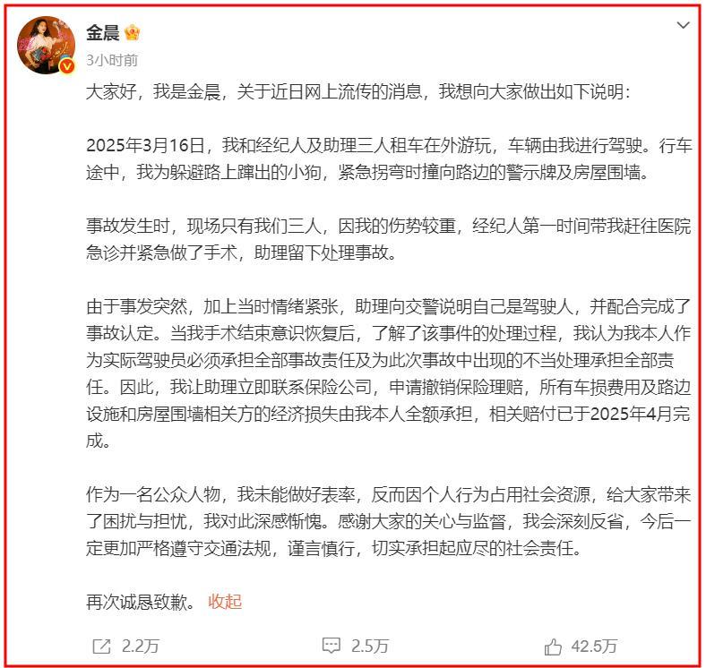 在長文的最後,金晨進行了道歉,表示會深刻反省,今後一定更加嚴格遵守交通法規,謹言慎行,切實承擔起應盡的社會責任。