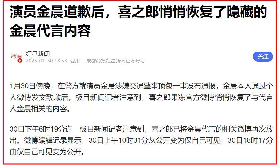 喜之郎則在官方賬號刪除或隱藏了與代言人金晨相關的內容。