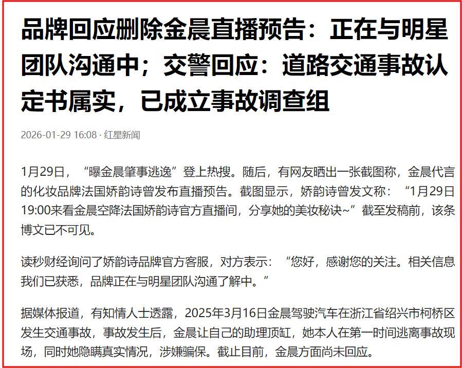 金晨是嬌韻詩的彩妝代言人,嬌韻詩取消了原本定於1月29日晚的金晨直播。