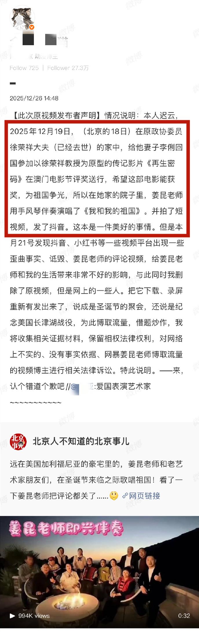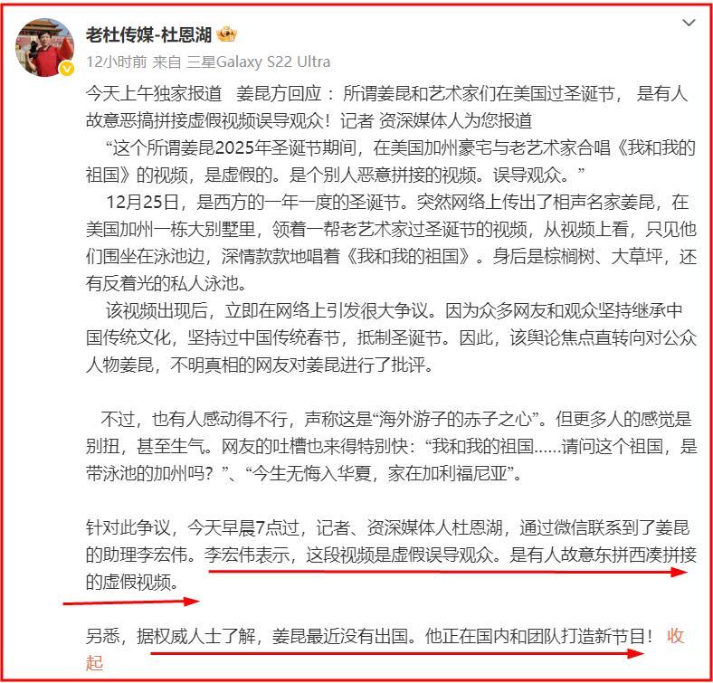 令她沒有想到的人,別有用心的人將視頻下載,並和其他視頻拼接在一起造謠姜昆,說他在美國過聖誕節唱愛國歌曲。
