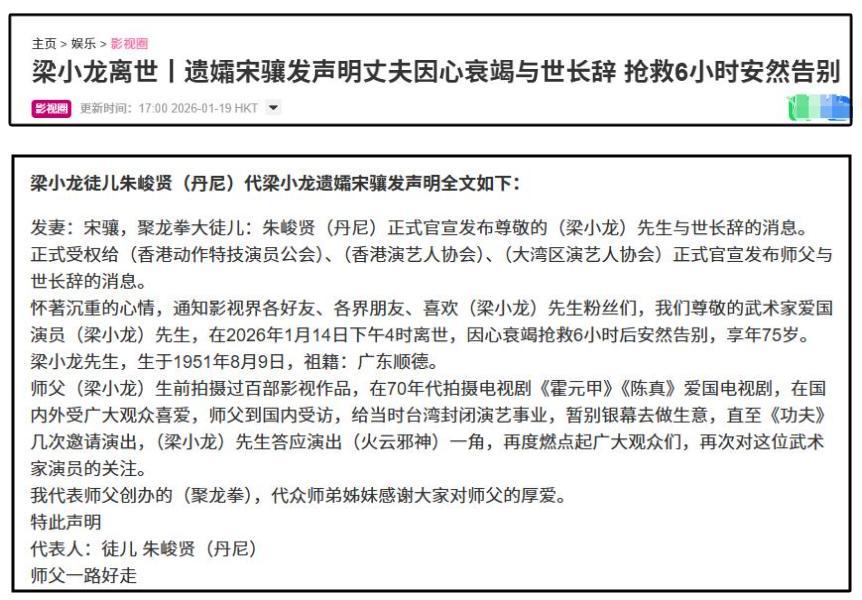 根據聲明可知,梁小龍因爲心臟衰竭在醫院搶救了6個小時,但最終還是不幸於1月14日下午4時去世,享年75歲。