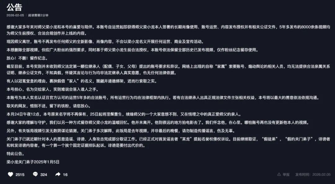 公告中還提到“本號實則並未收到師父法定第一順位繼承人(配偶、子女、父母)提出的賬號要求和異議。網絡上出現的自稱家屬索要賬號、煽動輿論的相關人員,均無法提供合法親屬關係證明、繼承公證文件,不知真假,懷疑其言論與行爲均非法定繼承人真實意願,也無任何法律依據。”