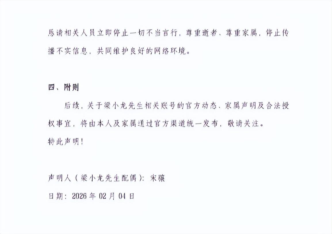 聲明稱有人未經家屬同意擅自運營梁小龍相關網絡賬號,發佈不實言論,因此發佈該聲明以正視聽。