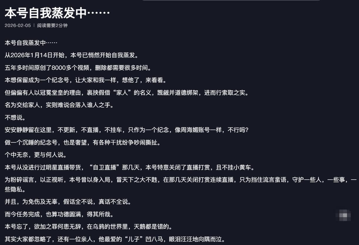 公告中還提到“本號實則並未收到師父法定第一順位繼承人(配偶、子女、父母)提出的賬號要求和異議。網絡上出現的自稱家屬索要賬號、煽動輿論的相關人員,均無法提供合法親屬關係證明、繼承公證文件,不知真假,懷疑其言論與行爲均非法定繼承人真實意願,也無任何法律依據。”