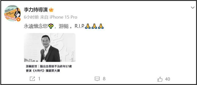 遊飈去世的消息被曝光後,令人震驚和心痛。目前網友們和李力持、雷晴雯等港圈人士紛紛發文悼念遊飈。