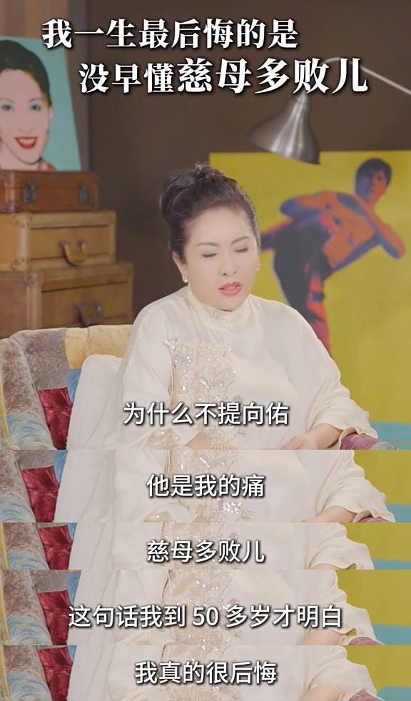 她說她一生最後悔的是沒早懂慈母多敗兒,直言向佑是自己的痛。