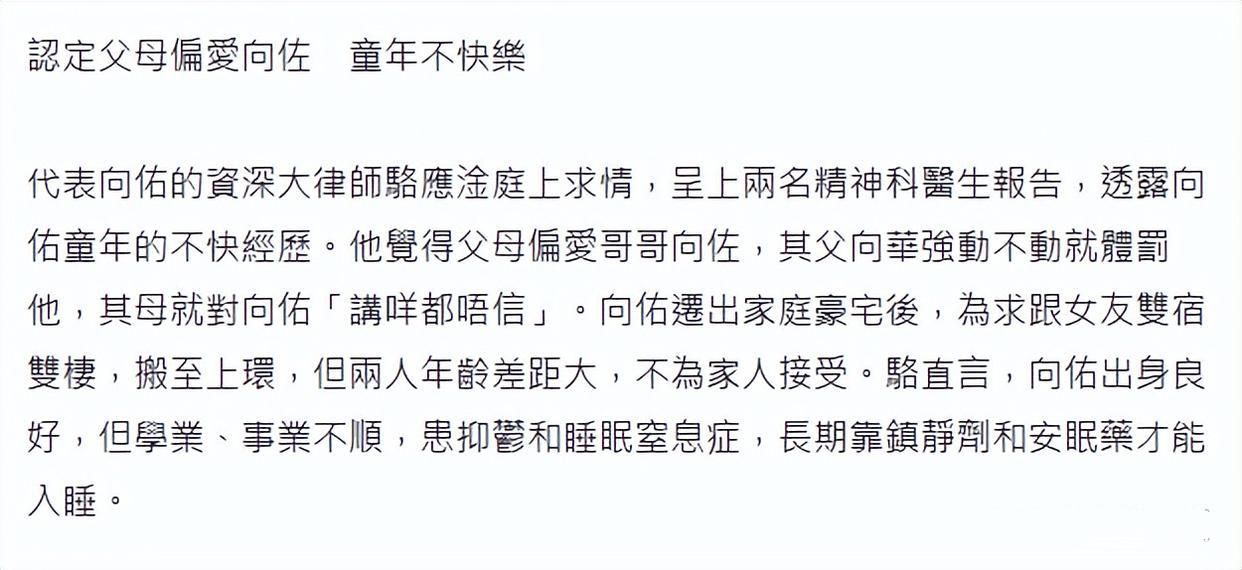 律師還透露,向華強陳嵐夫婦不接受向佑的個人選擇,不接受他的女朋友,以至於向佑搬出了家,在外面租房居住。