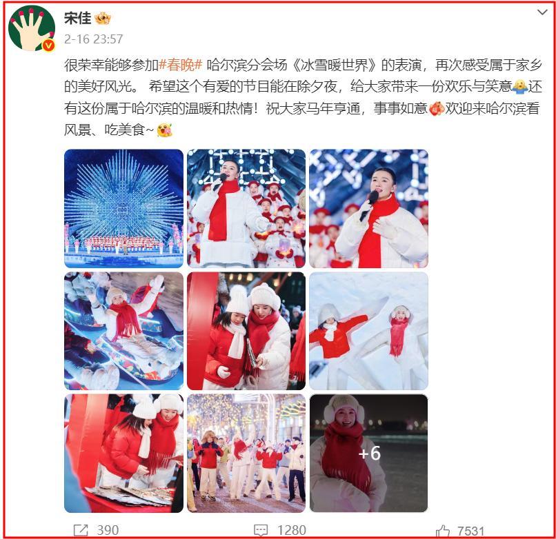不難看出,這是春晚對宋佳的認可,也是宋佳老家哈爾濱對她的認可。