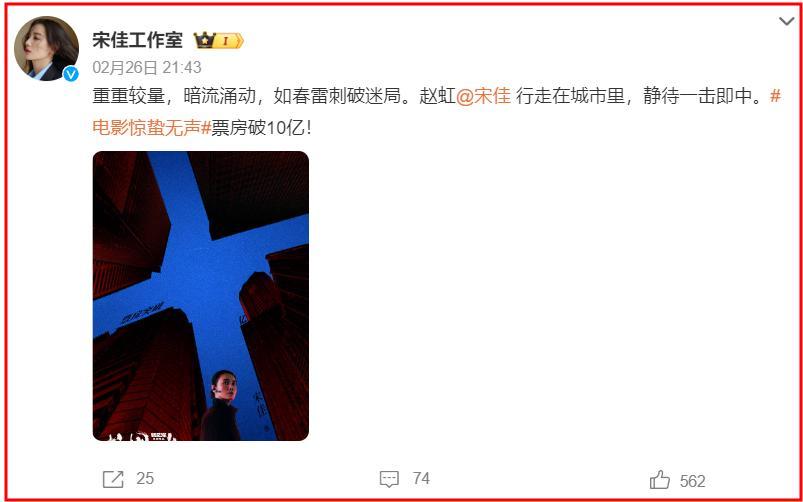 到了2月26日,宋佳又讓工作室發佈了一條喜訊,這條喜訊便是《驚蟄無聲》票房破10億了。
