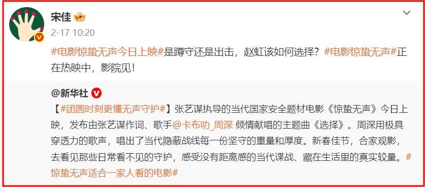 緊接着她又高調宣佈她主演的電影《驚蟄無聲》上映,而這部電影由張藝謀執導,由宋佳和朱一龍、易烊千璽、雷佳音等人主演。