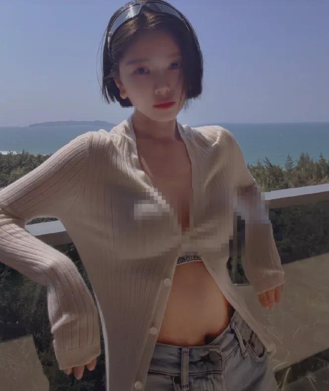這組照片是王燦在三亞度假時拍攝的,碧海藍天做背景,她穿着簡約的泳裝,外面搭配了一件輕薄的針織衫。
