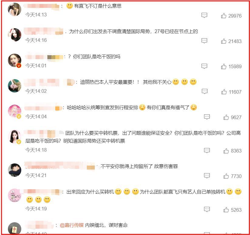 迪麗熱巴的粉絲大罵經紀公司謀財害命,質問經紀公司爲什麼不關注國際形勢?質問明明可以直達,爲什麼要從迪拜轉機?