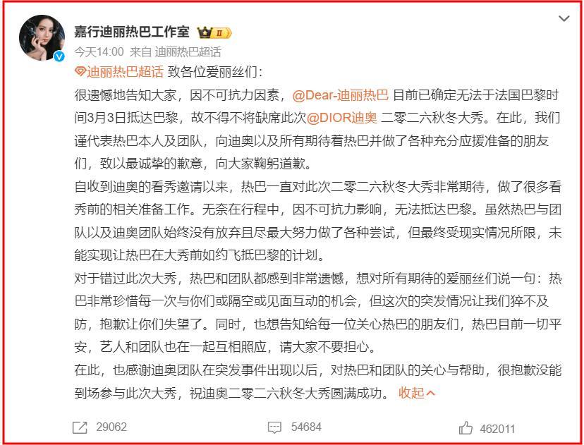 但因爲局勢的變化,迪麗熱巴滯留迪拜,無法參加迪奧大秀。