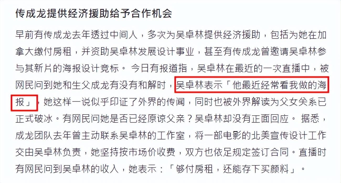 彼時港媒爆料稱成龍通過中間人,多次爲吳卓林提供經濟援助,包括爲女兒在加拿大繳付房租、資助女兒發展設計事業。