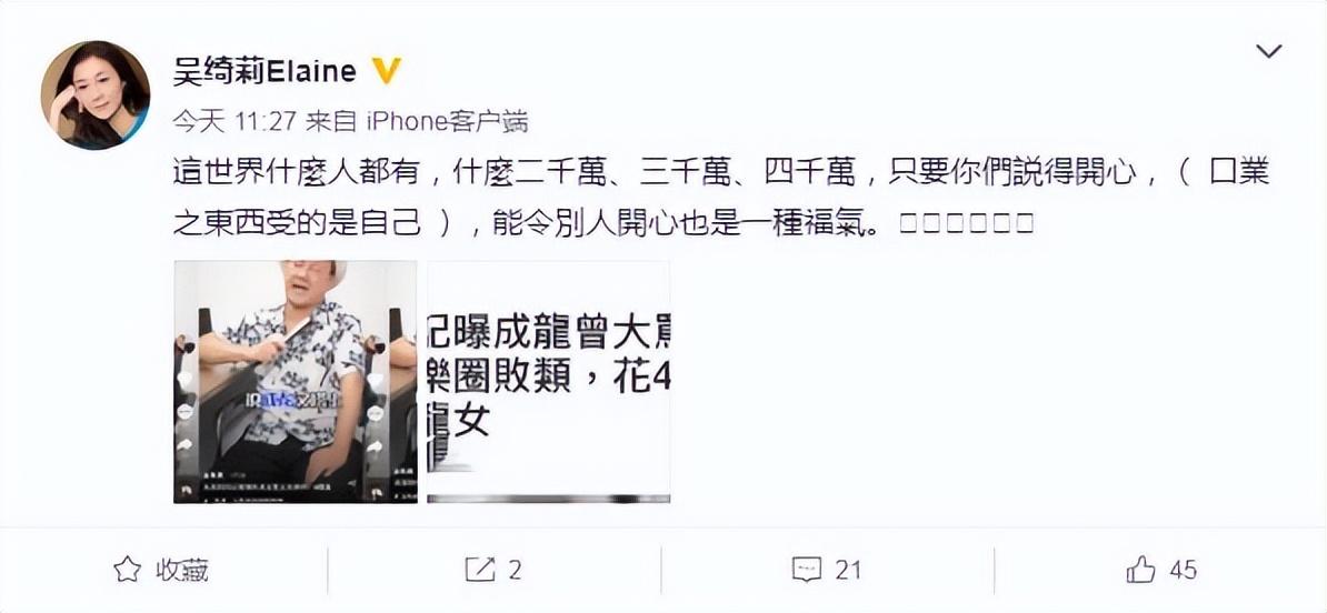 看完吳綺莉的訪談,有網友感慨原來成龍和吳卓林關係破冰的傳言是假的啊,還以爲成龍早就看開了呢。