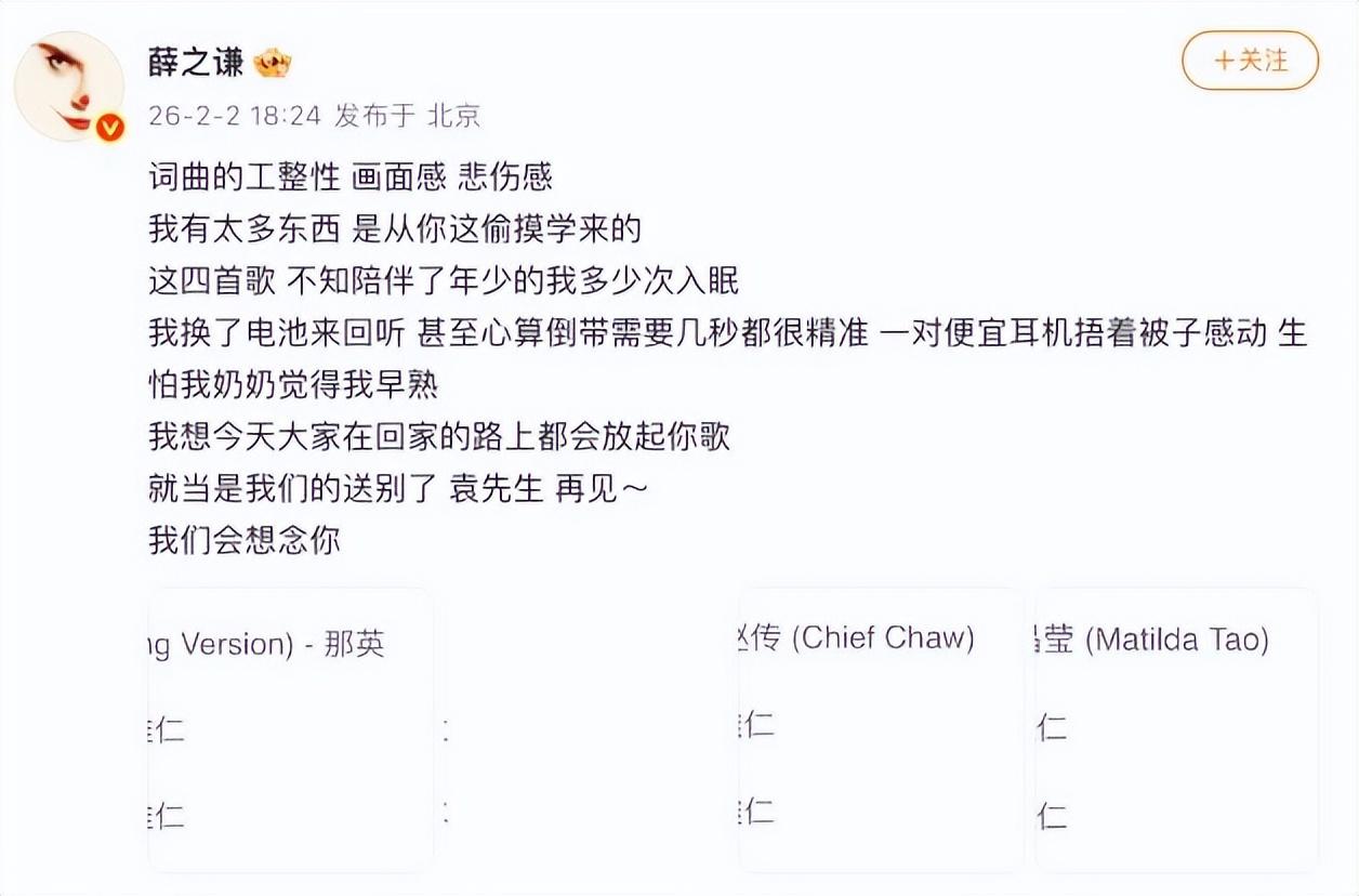 值得一提的是,也是在告別儀式這一天,內娛的那英、老狼、薛之謙、陳楚生等歌手,也紛紛發文悼念了袁惟仁。