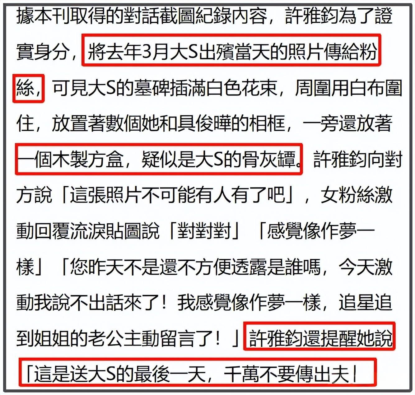 但令許雅鈞沒想到的是,他說完這些之後,女粉絲就將大S的出殯照發到了粉絲羣,更多的人看到了這張照片。最終這張照片泄露,臺媒對此事進行了報道。