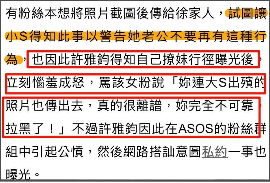 這位女粉絲在網上多次發文爲大S說話,許雅鈞也是以此爲契機私聯了這位女粉絲。