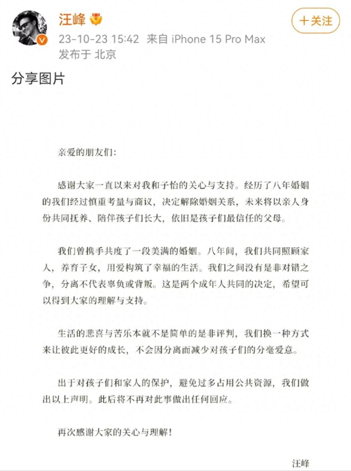 可是誰承想,2023年10月23日,他們突然官宣離婚了。