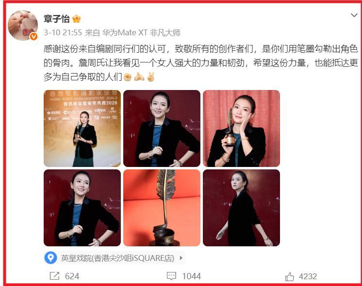 獲獎之後,章子怡特意發文感謝了編劇同行們的認可,她還說詹周氏讓她看見一個女人強大的力量和韌勁,希望這份力量,也能抵達更多爲自己爭取的人們。