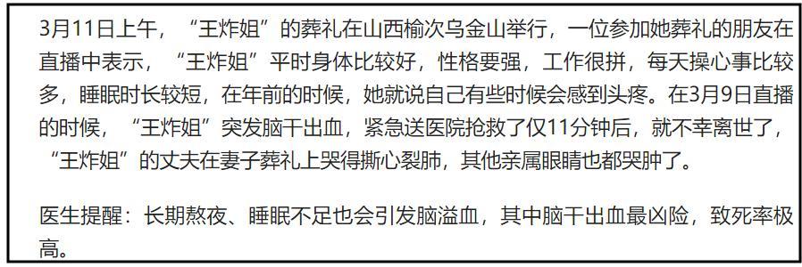 如今,王炸姐離世一事引發全網關注,媒體採訪了知情人,知情人透露王炸姐的死因是腦幹出血。