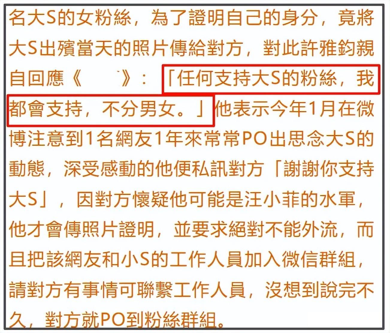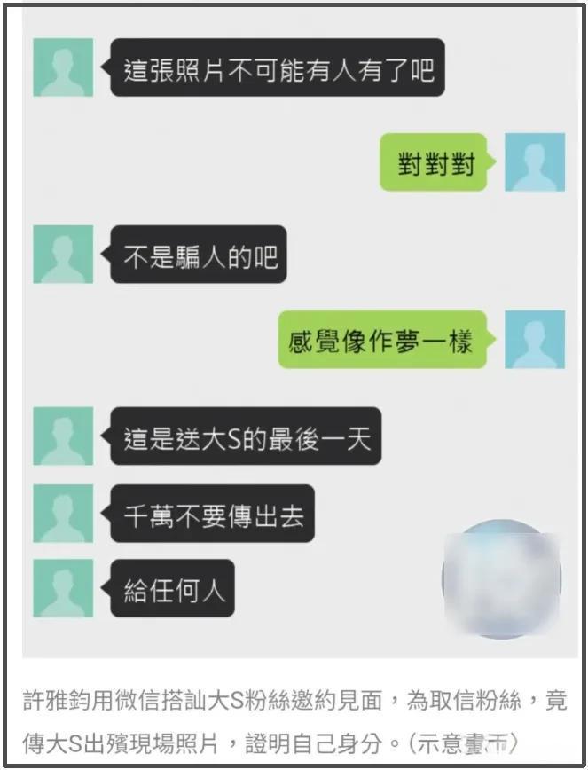 先來說說S家,前幾日,小S的老公被臺媒爆料利用大S的出殯照“約妹”,許雅鈞和對方的聊天記錄都被曝光了。