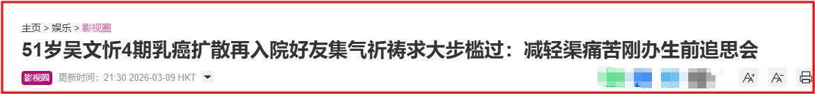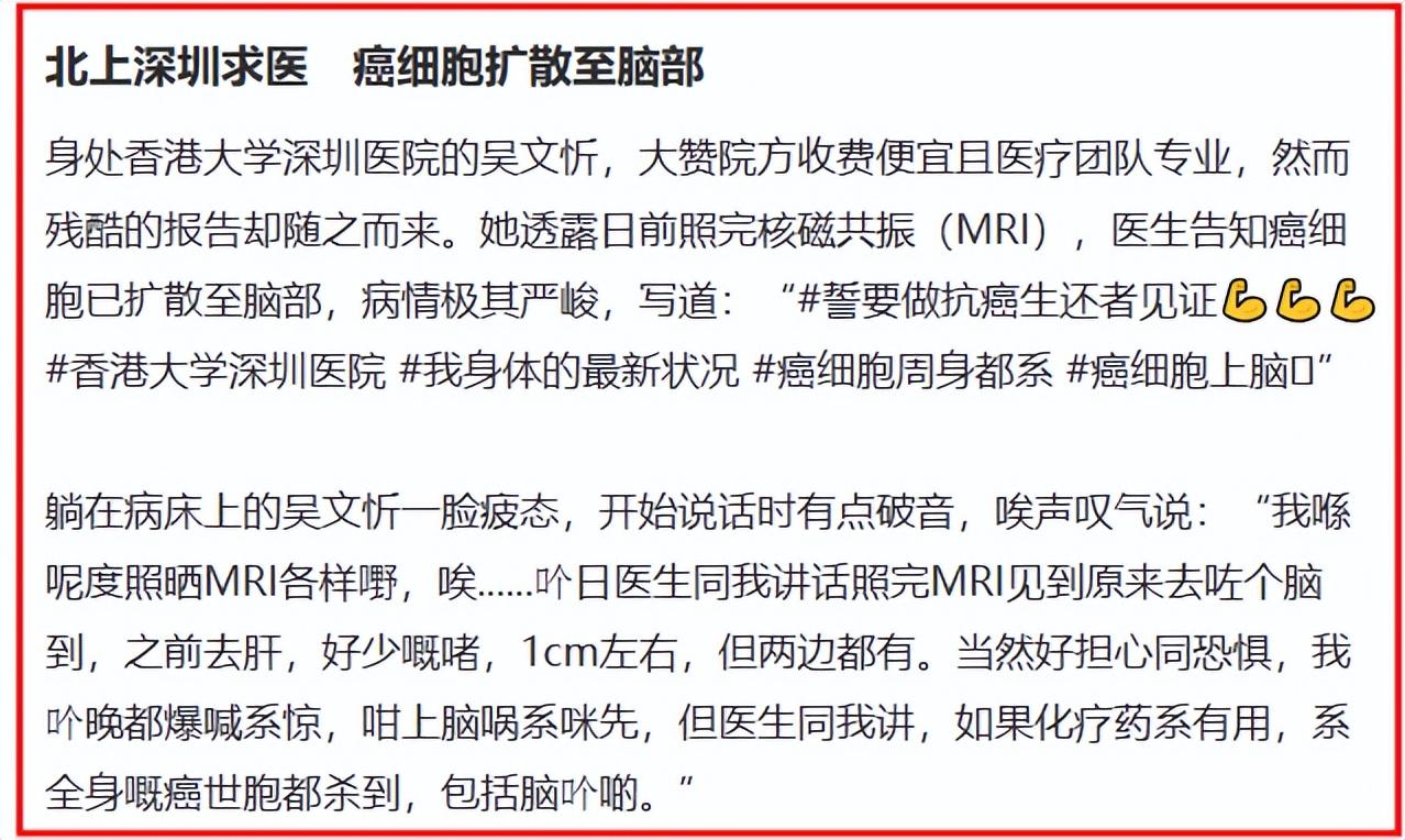 2025年,吳文忻的乳腺癌進入末期,癌細胞擴散至淋巴、龍尾骨,還有肝臟。