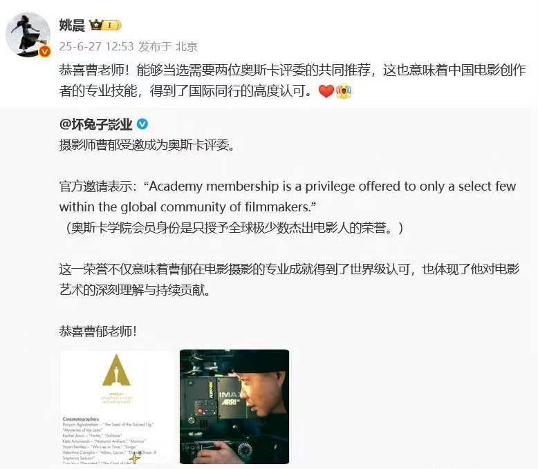 據瞭解,曹鬱是圈內著名的攝影師,代表作包括《可可西里》《南京!南京!》《妖貓傳》《無問西東》《八佰》的那個電影,獲得過金雞獎、華表獎、金像獎、聖塞巴斯蒂安國際電影節的最佳攝影獎。