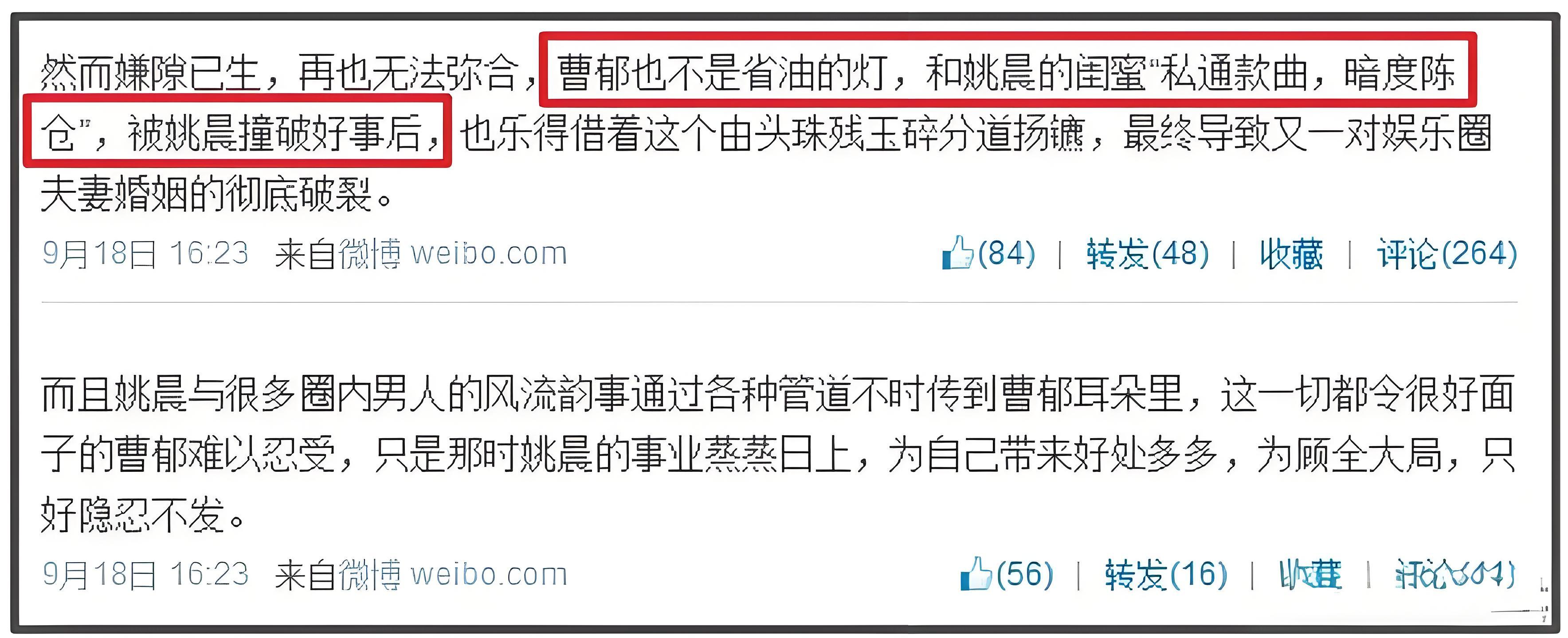 更炸裂的是,這位博主稱曹鬱出軌了姚晨的閨蜜,還被姚晨撞破了。