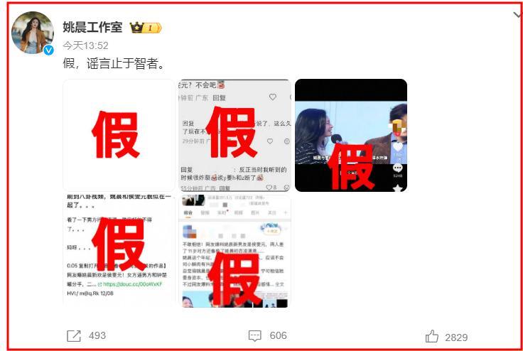 3月18日,姚晨工作室曬出報道姚晨和侯雯元緋聞的爆料貼、文章和視頻截圖,直言“假,謠言止於智者”。
