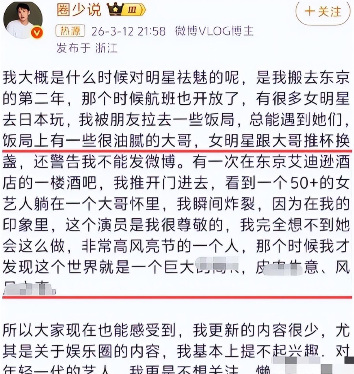 博主表示早已對明星祛魅,曾親眼看到女明星與資本大佬推杯換盞,自己還被威脅不準發微博,更顛覆三觀的是,一位他曾經尊敬的 50 + 女星,公然依偎在資本大佬懷裏。