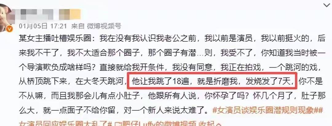 還有退圈女演員爆料,自己因拒絕導演的無理要求,被故意刁難,在寒冬臘月跳河 18 遍。