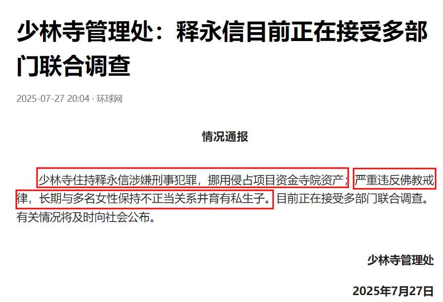 第一次通報(2025 年 7 月,少林寺管理處):措辭極其嚴厲,直接披露釋永信兩大核心問題 —— 涉嫌刑事犯罪,挪用、侵佔寺院項目資金與公共財產;嚴重破戒,長期與多名女性保持不正當關係,育有私生子。