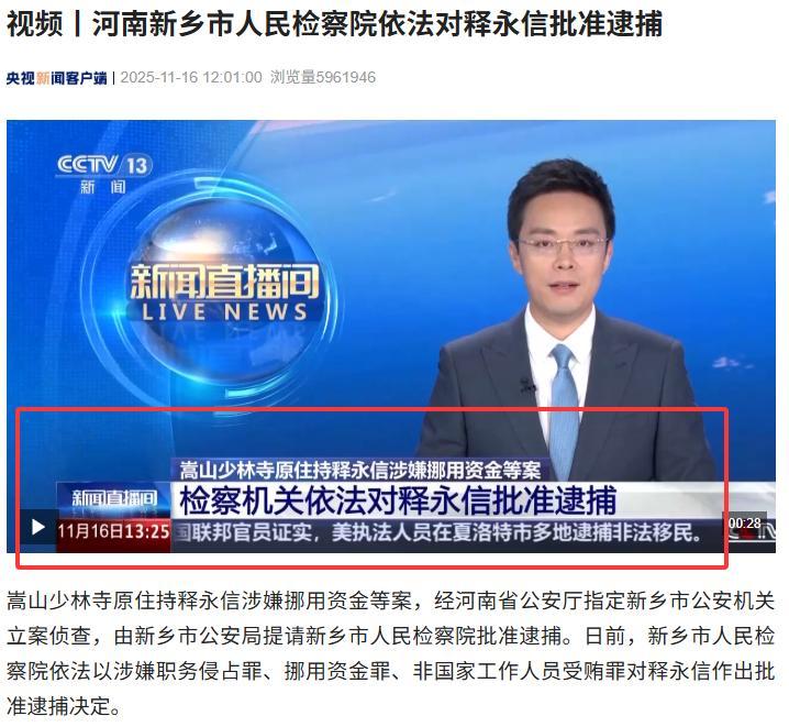 第二次通報(2025 年 11 月,新鄉市人民檢察院):依法對釋永信作出批准逮捕決定,剔除道德層面問題,明確列出三項法律罪名:職務侵佔罪、挪用資金罪、非國家工作人員受賄罪。