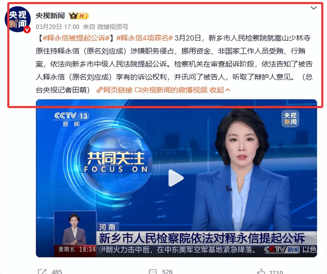 第三次通報(2026 年 3 月 20 日,新鄉市人民檢察院):正式對釋永信提起公訴,罪名在原有三項基礎上新增行賄罪,以四項罪名追究其刑事責任。