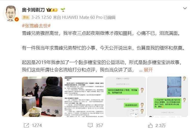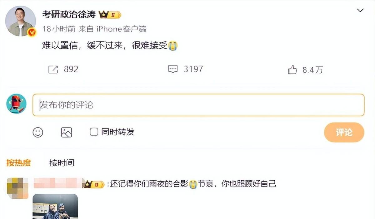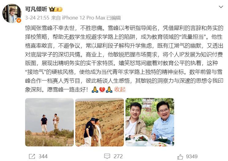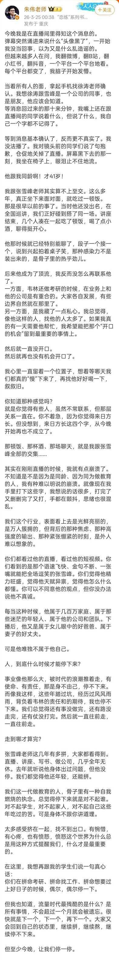 稍微調整情緒後,他發佈長文悼念張雪峯。文章寫得情深意切,令人淚目。