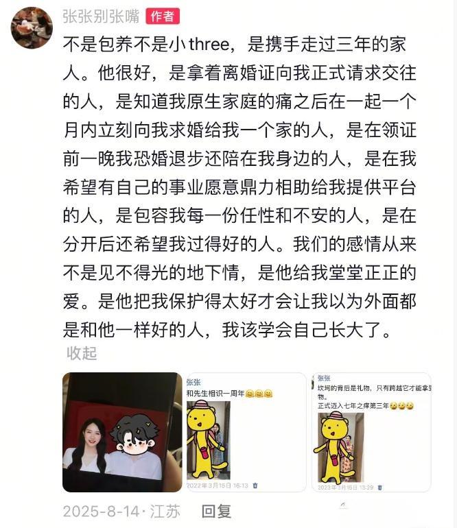 而在前幾年,她曾發文回應和張雪峯的關係,他說他們光明正大的在一起三年,但是因爲她恐婚和家裏有親人去世,3年不能辦喜事,她和張雪峯就慢慢走散了。