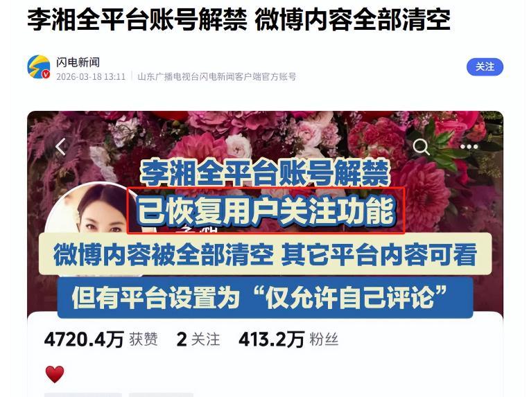 然而,面對賬號被禁,李湘卻保持沉默,不做回應。