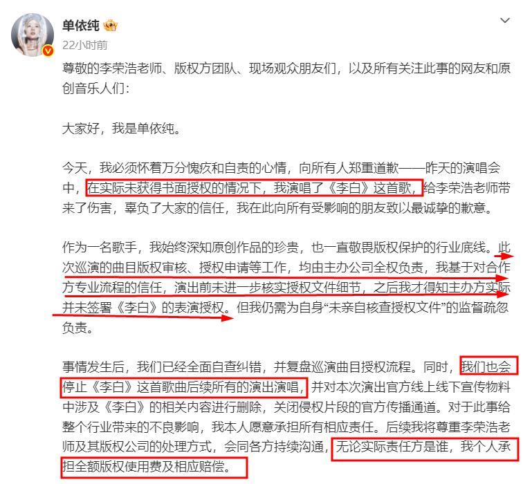 她說她會停止演唱《李白》,刪除相關物料,她還說無論實際責任方是誰,她承擔全額版權使用費和相應賠償。