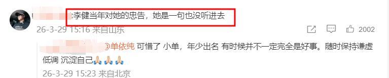 還有人提到當年李健對她的忠告,讓她要腳踏實地,不要忘記初心。網友感慨地說李健的話單依純一句沒有聽進去。