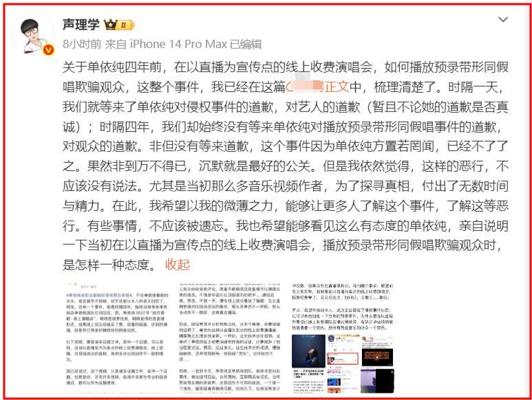 如今單依純出現侵權事件,“聲理學”重提此事,認爲她播放預錄帶的行爲與商演假唱無異,希望她回應此事,給消費者和熱愛音樂的聽衆一個交代。