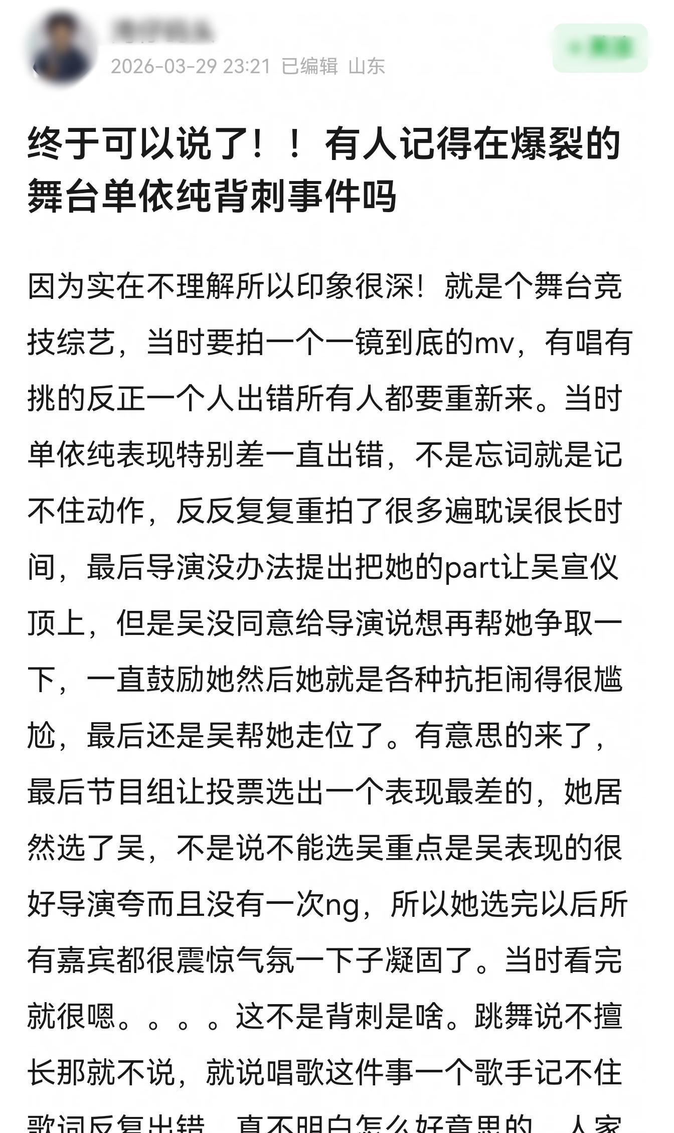 他希望單依純好好回應此事,不要假裝不知道,說都是公司乾的。也不要在3月29日晚的演唱會上哭哭啼啼,博取同情。