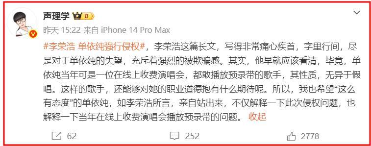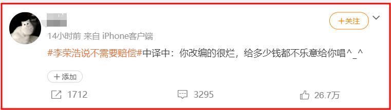 對於李榮浩的回覆,網友對他的話進行了中譯中,直言他想對單依純說的是“你改編的很爛,給多少錢都不樂意給你唱。”