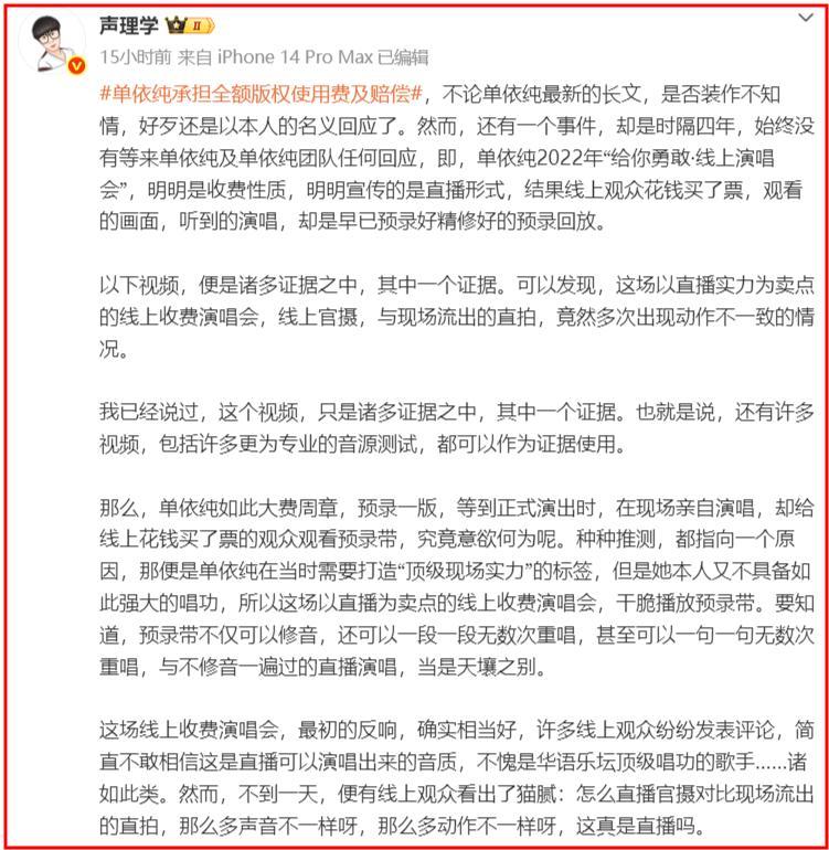 有音樂博主發聲稱2022年單依純舉辦了“給你勇敢·線上演唱會”,當時這場線上演唱會是收費的,而且宣傳的是直播、全開麥。結果花錢的觀衆看到的畫面,聽到的演唱,是早已預錄好的精修好的預錄回放。