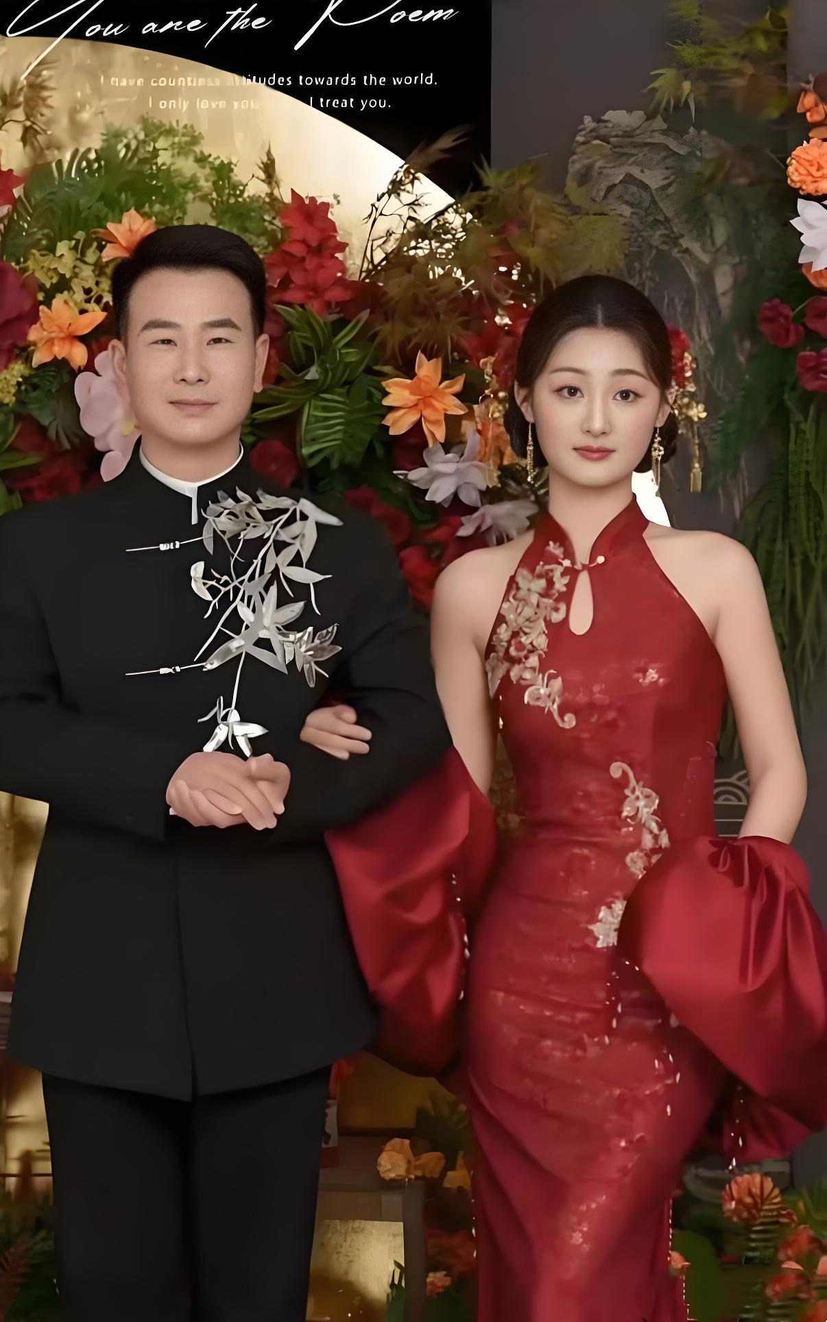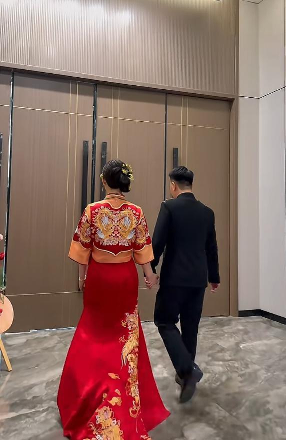 視頻中的陳亞男穿着中式秀禾,她的未婚夫穿着黑色中山裝。