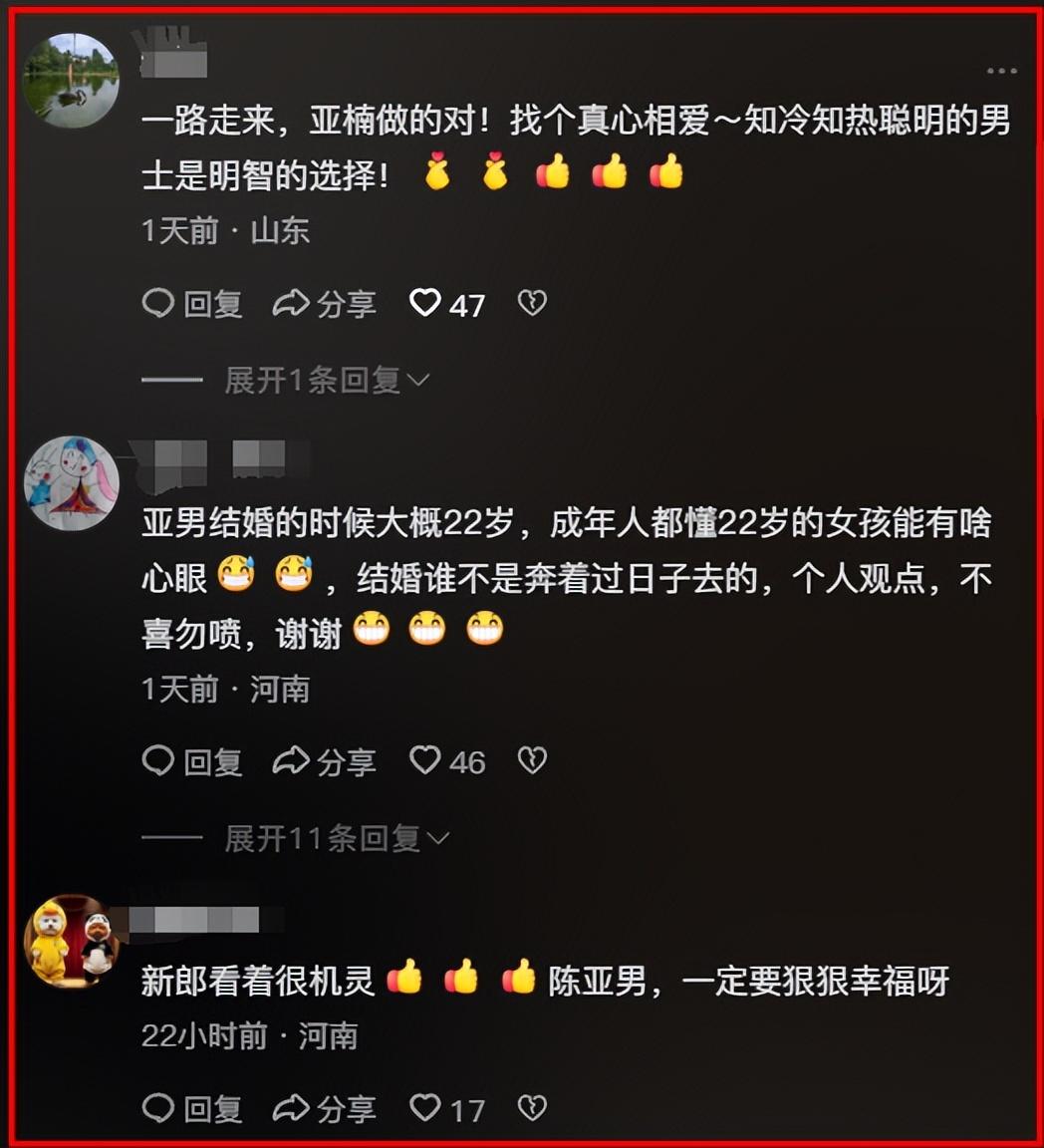 翻看陳亞男和她閨蜜賬號的評論區可以發現,大家都是祝福,評論出奇的一致。