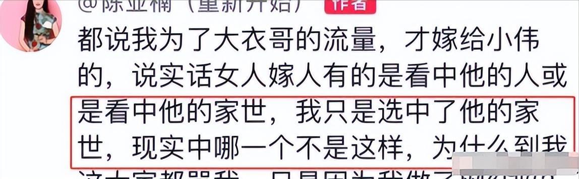 面對爭議,陳亞男委屈地發文說女子嫁人,要麼圖對方的人,要麼圖對方的家世,這是很正常的事情,怎麼到她這就成爲全網批評的事情了。