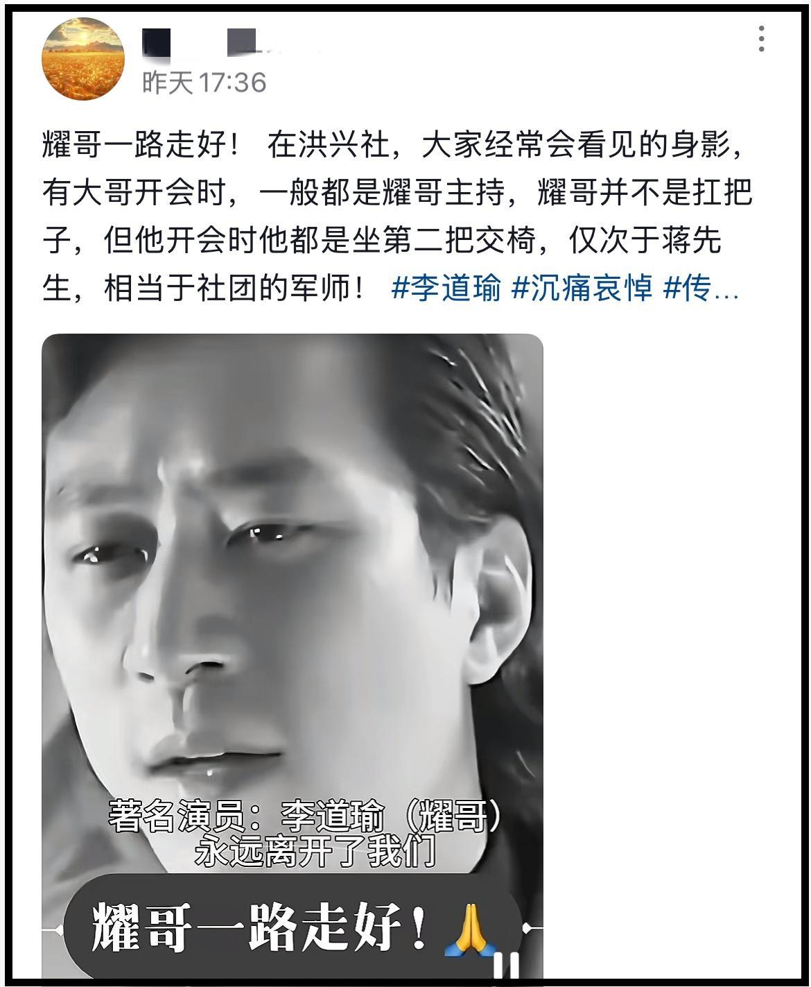 李道瑜去世一事,4月4日就有多位網友爆料,並且他們紛紛發文悼念李道瑜。